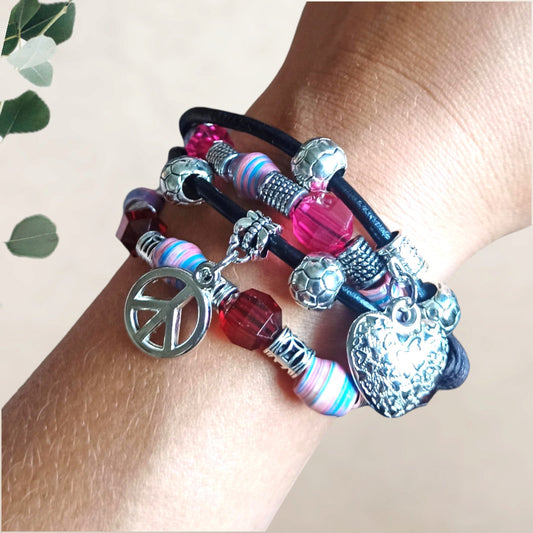 Armband leerkoord met bedeltjes